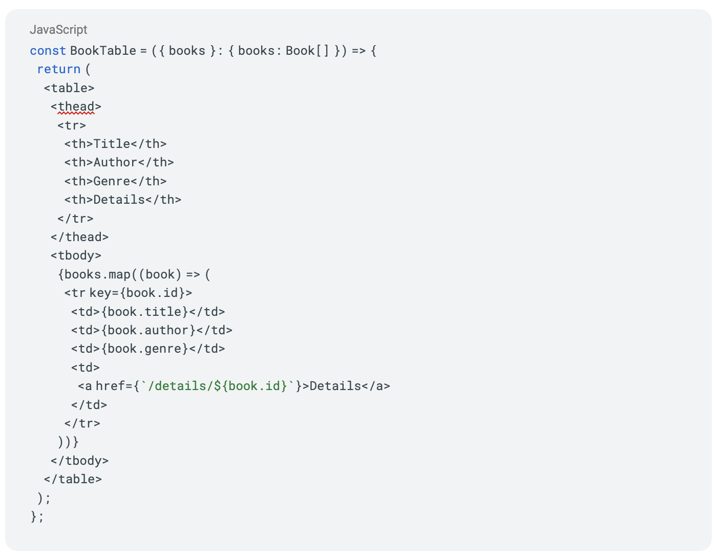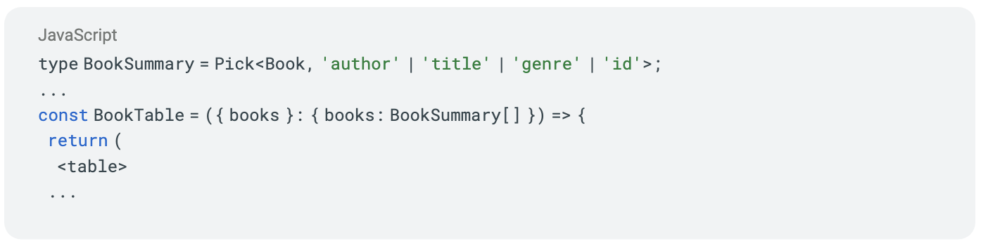 Looking at the BookTable component a little closer, we can see there are only a handful of fields from the Book type which are being used in the component: the author, title, genre, and id. We can modify the props of the BookTable to expect a partial set of values from the Book type using TypeScript’s Pick Utility Type: