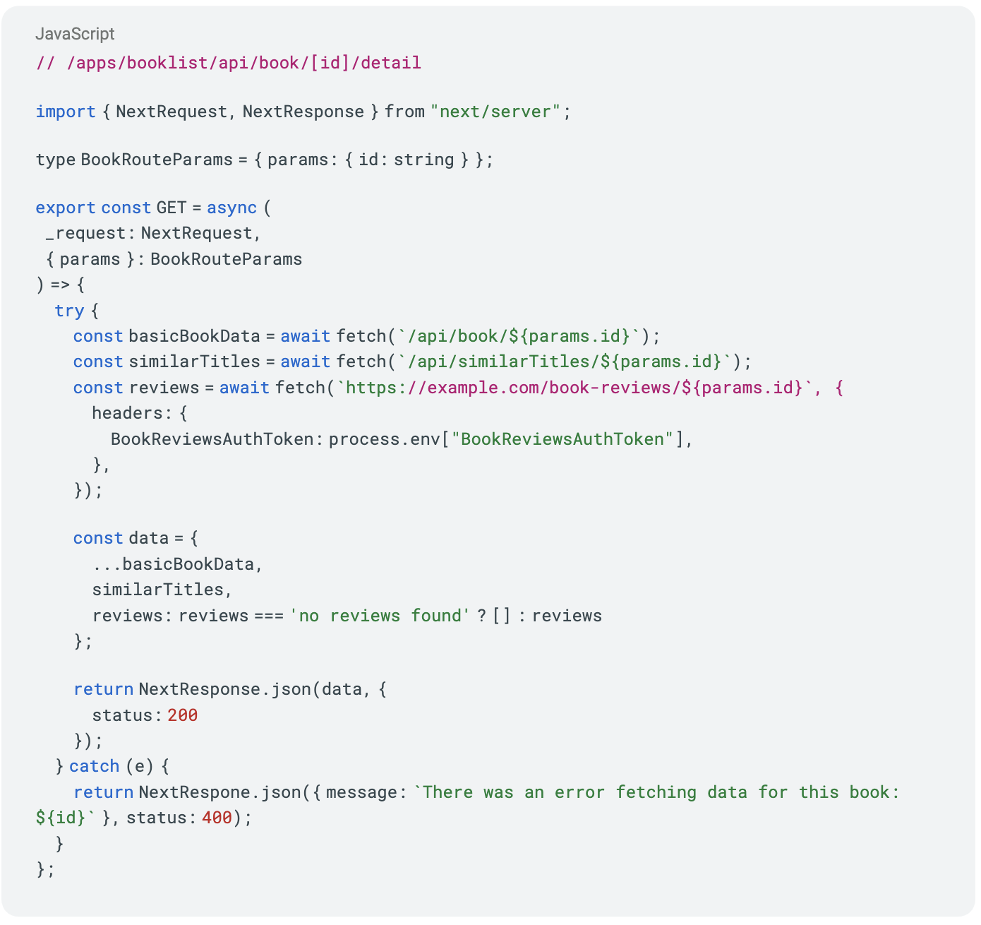 Let’s say we need to query our own apis to fetch the book and similarTitles. And let's say we are using a third-party service for reviews that either return an array of Reviews or a single string that reads 'no reviews found'. Also, it requires that a secret token be included in the headers of the request.